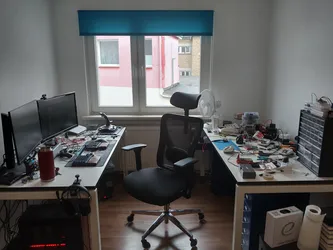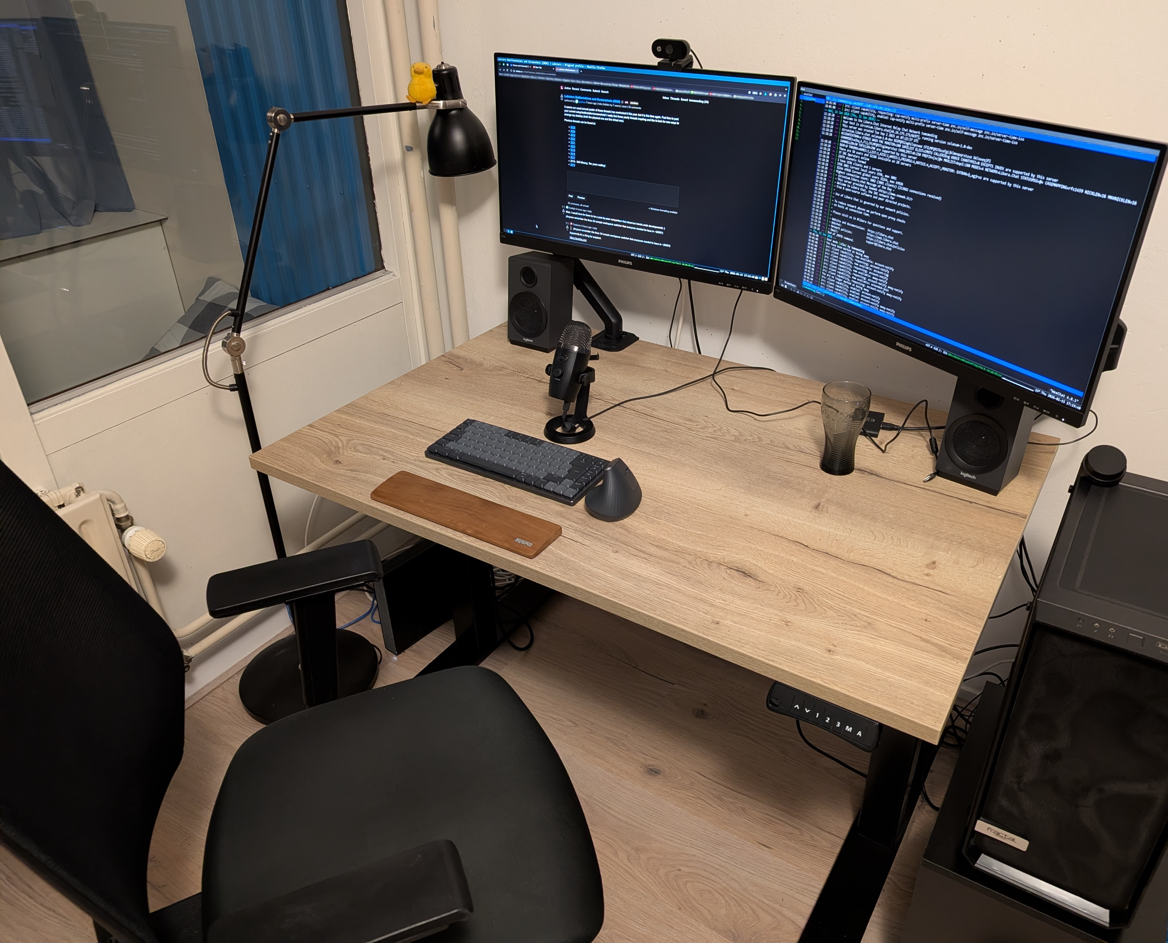 2 Philips 27.5 inch monitors, logi mx mechanical keyboard, logi mx vertical mouse. Self-built PC from 2021 with an Intel i9-10900K inside, 32 GB RAM. Runs i3. The worst cable mess is hidden below the desk :)