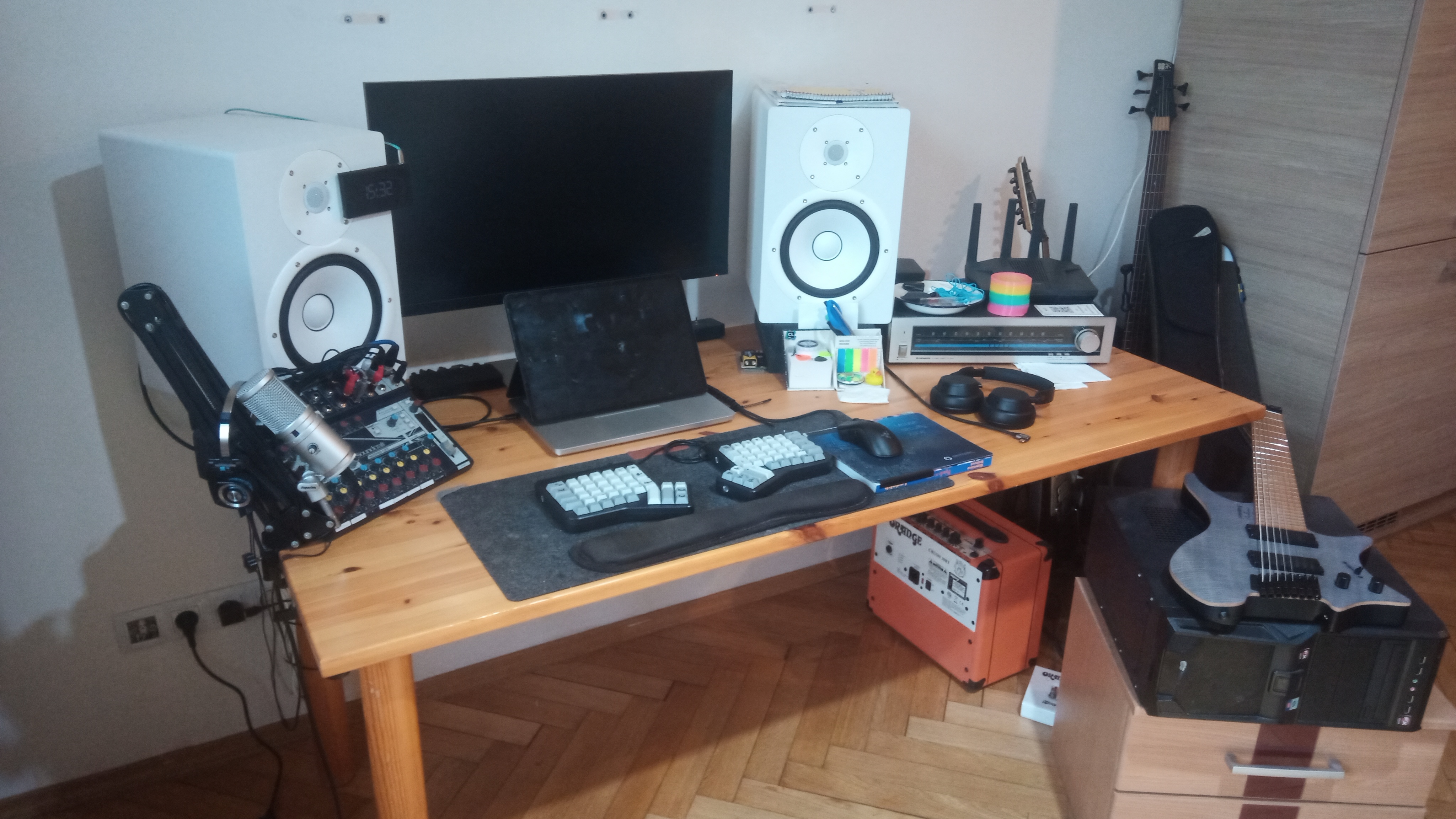 I spend way to much time here, working from home, having gaming as a hobby and I've started dabbling with music production (very early, still just playing around with it). Macbook Pro for work, a desktop running Arch on the floor for personal use, a couple of mechanical keyboards, a condenser mic from Rode, a pair of Audioengine A2+ speakers, a small midi controller from Akai for previously mentioned music production experimentatio, i also got a scarlett solo audio interface for the microphone and also to drive the Sundara headphones to the right.